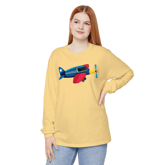 Unisex Garment-dyed Long Sleeve T-Shirt - Colorful Vintage Airplane Illustration - Retro Aviation Design