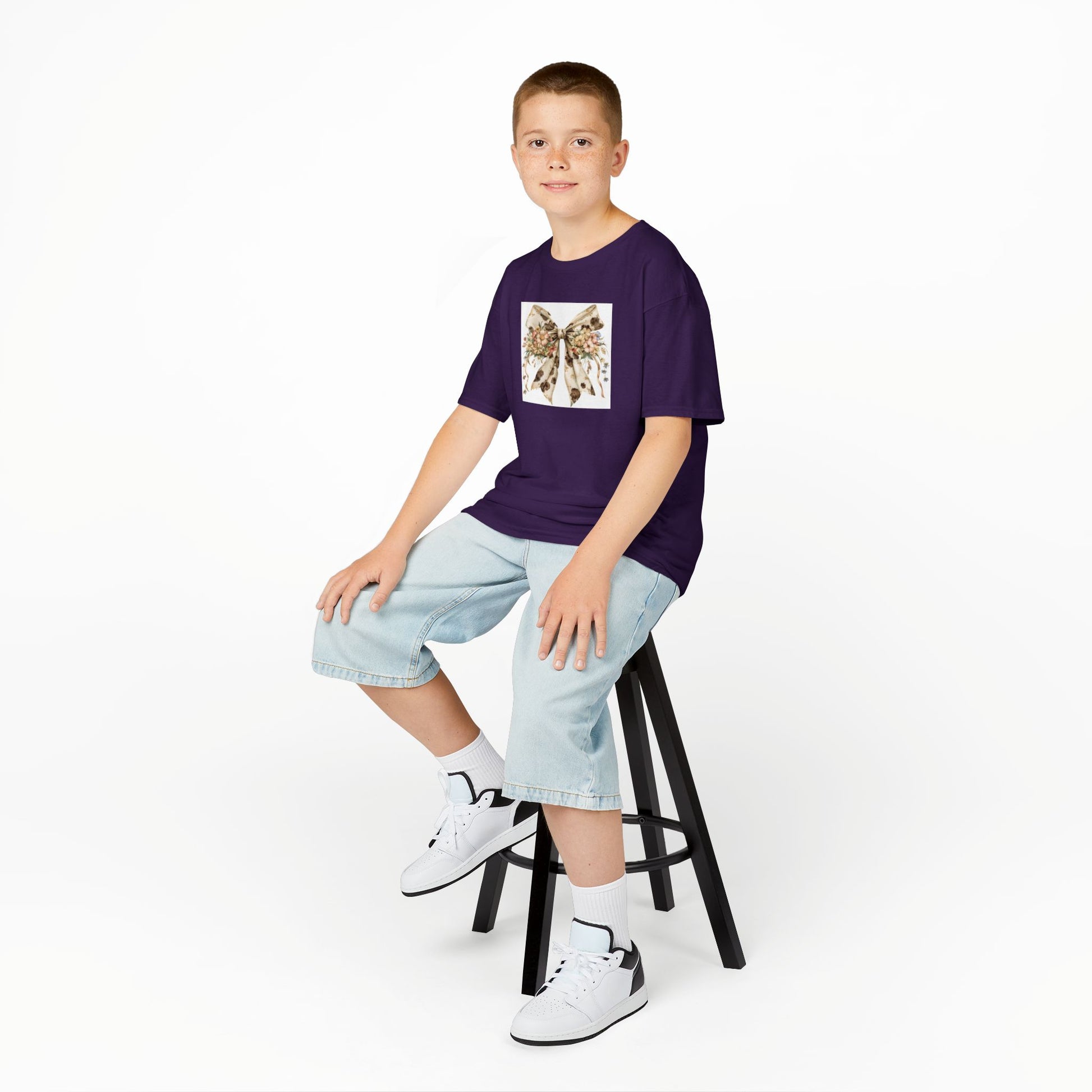 Kids Heavy Cotton™ Tee - Elegant Cowhide Ribbon Bow with Wildflower Bouquet - Perfect for Birthdays and Everyday Fun