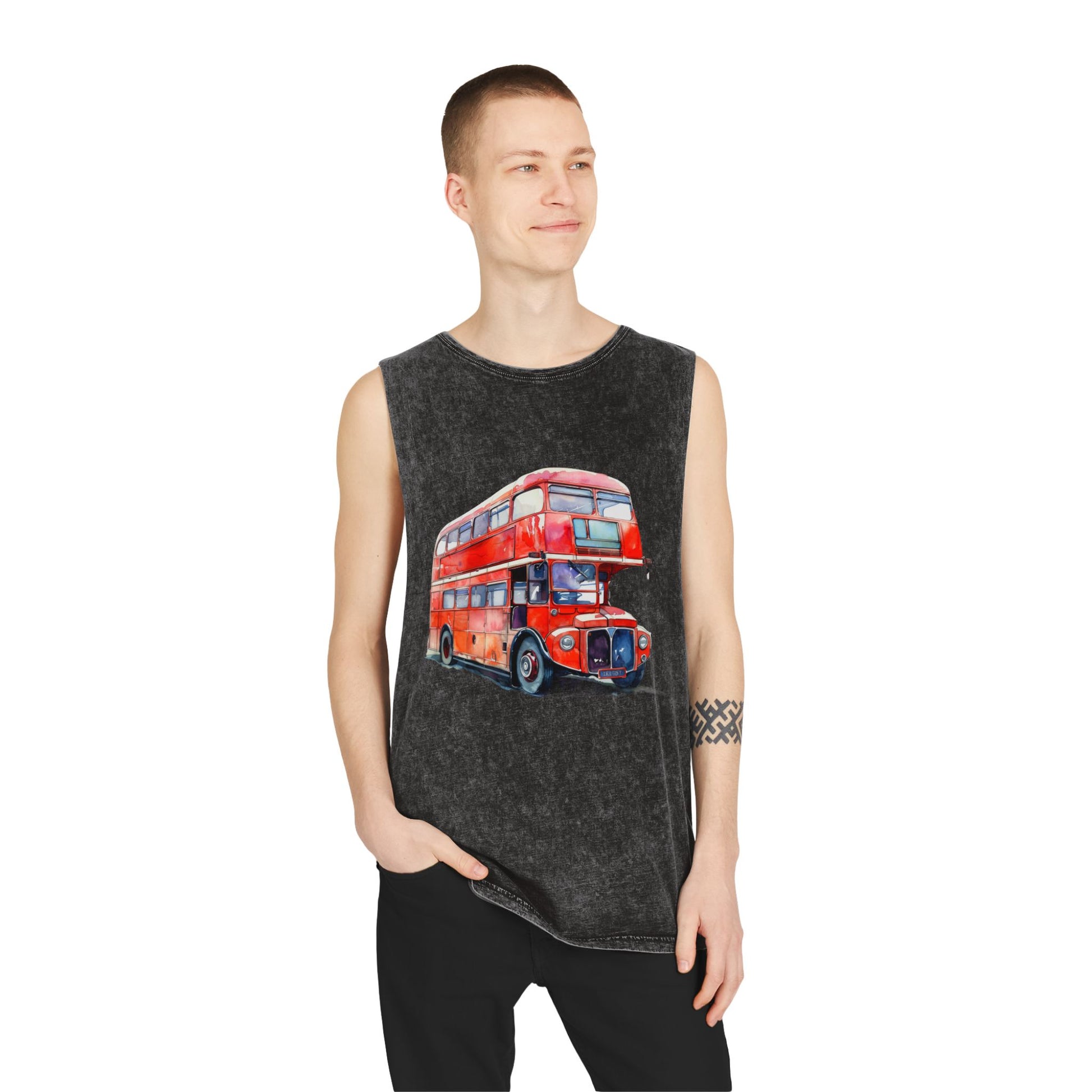 Unisex Stonewash Tank Top - London Transport English Bus - Iconic Red Double-Decker Design